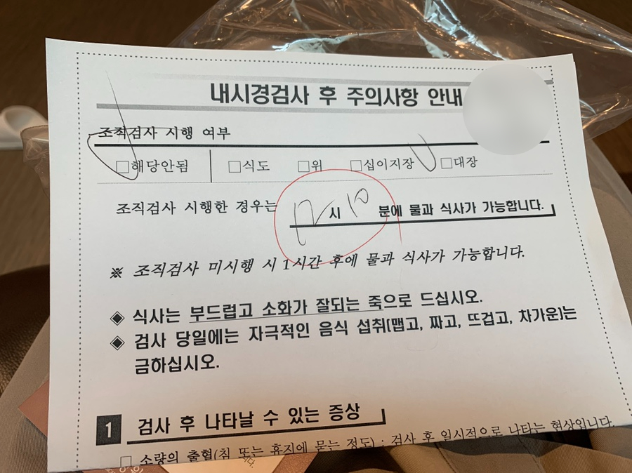 무엇보다 탈수 예방을 위해 30분 간격으로 물 500cc를 전날은 3회, 당일은 2회 마시게 되어 있어요. 남편의 안내문을 제대로 읽지 않고 추가로 물을 마시지 않아 힘이 없어서 힘들었습니다. 바보(눈물)